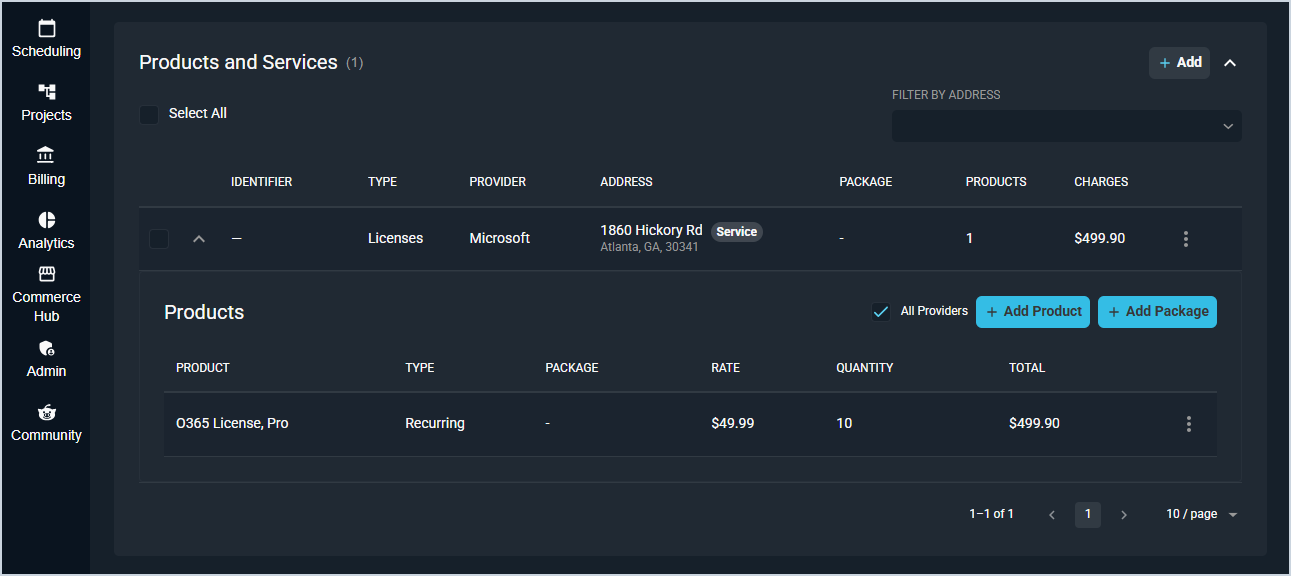 The Products and Services section displays all products and services included in the quote. Click the + Add button to add a new product or service, or click + Add Your First Service if no products have been added yet. See the Adding Services, Products, and Packages to Quotes article for more information.