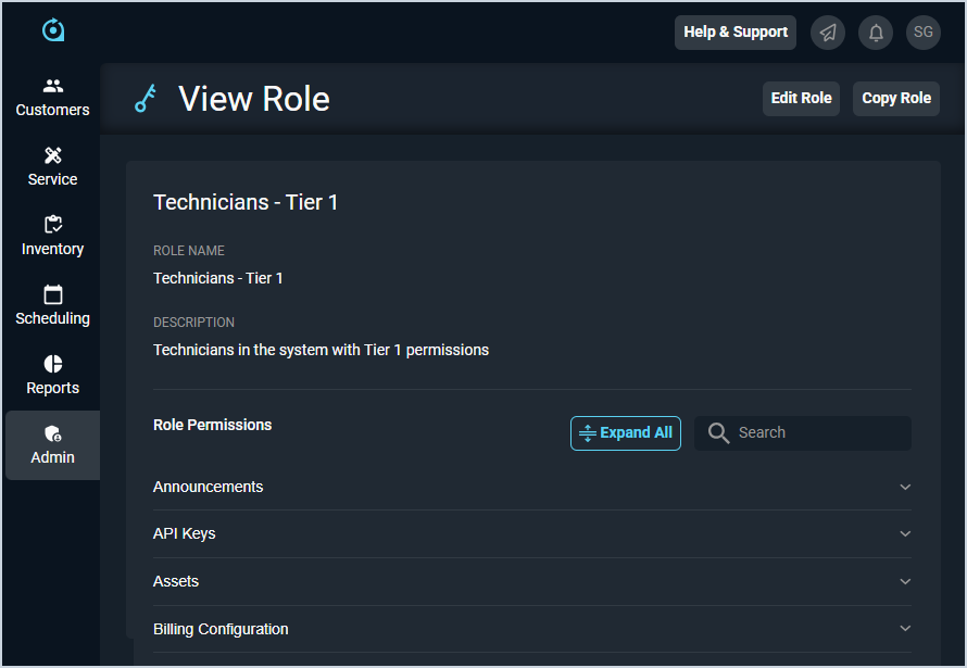 - View permissions available to the user by clicking the Expand All button in the Role Permissions section.