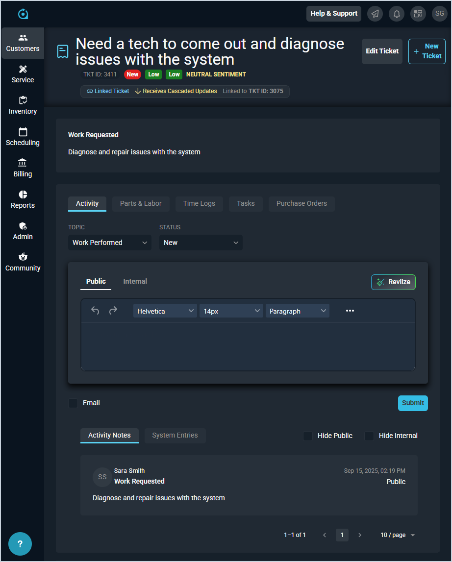 The Ticket Details screen allows you to view all relevant details for individual tickets, access several tabs to manage those tickets, and send ticket invoices over to Rev.io Billing for processing.
