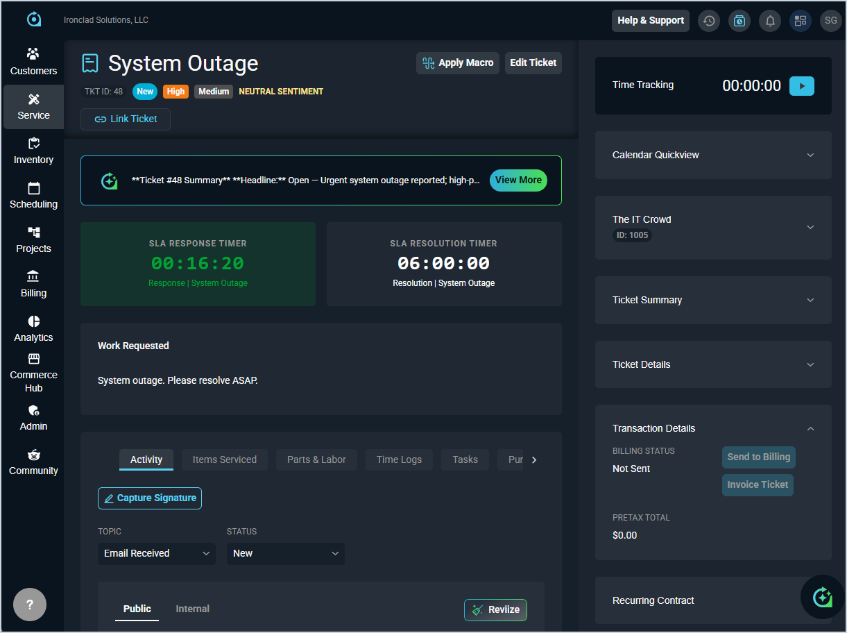 When a ticket is associated with a customer that has an active SLA policy, the SLA Response Timer and SLA Resolution Timer display on the ticket detail view. Each timer shows the time remaining to meet the corresponding SLA target based on the policy assigned to the customer and the priority of the ticket. The name of the applicable SLA policy and its target are shown below each timer for reference.