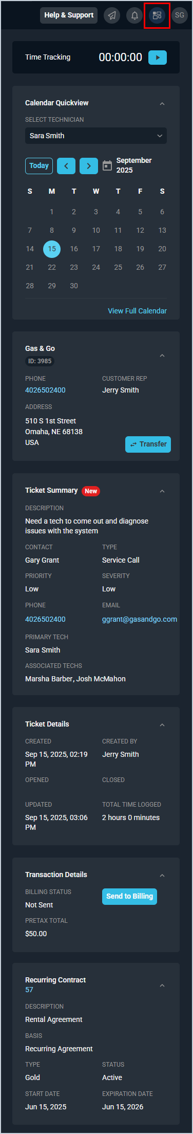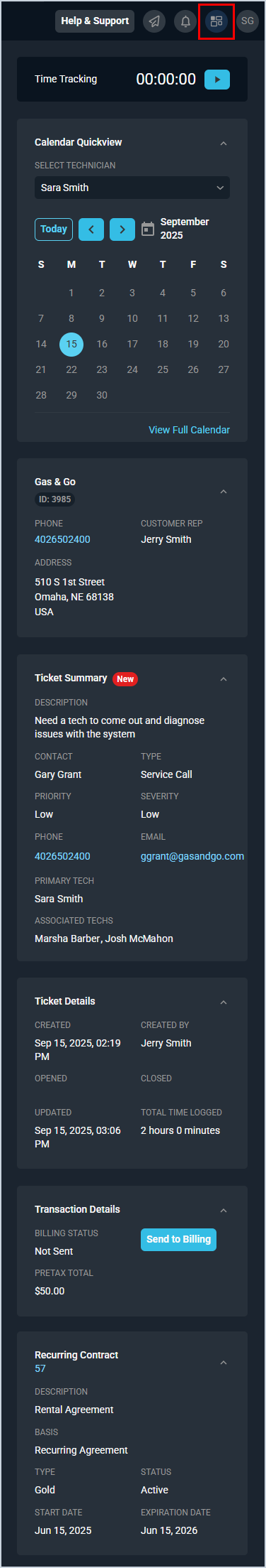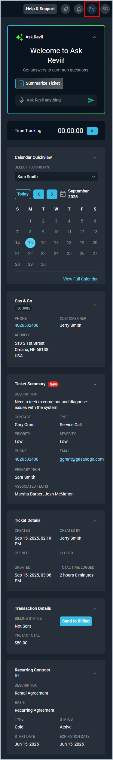 - View details for the contract tied to the ticket in the Recurring Contract section. See the View Contract: Details article for more information.